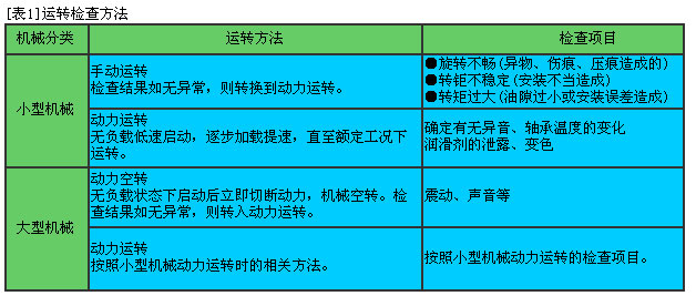 · 軸承安裝后,應(yīng)立即進(jìn)行運(yùn)轉(zhuǎn)檢查,以確認(rèn)安裝是否正確。[表1]給出了運(yùn)轉(zhuǎn)檢查的方法。若在運(yùn)轉(zhuǎn)檢查中發(fā)現(xiàn)異常,應(yīng)立即停機(jī),對(duì)機(jī)器進(jìn)行檢查,常見(jiàn)問(wèn)題的產(chǎn)生原因及對(duì)策參見(jiàn)[表2]。